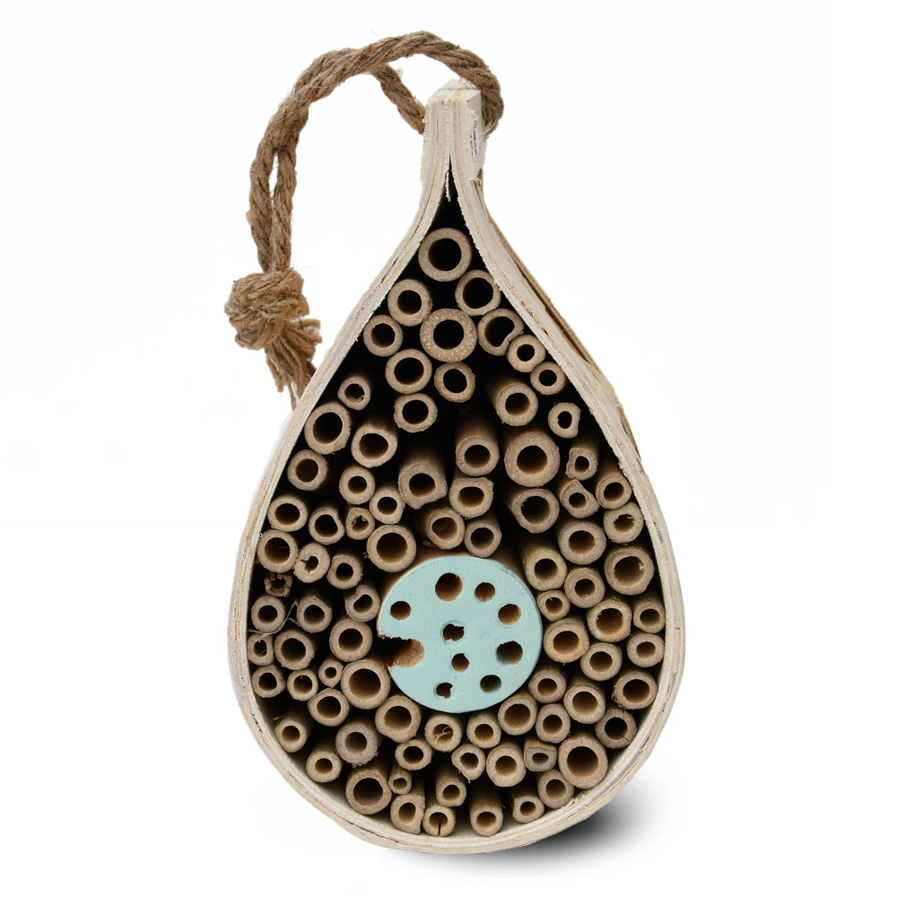 Dit druppelvormige bijenhuis trekt solitaire bijen aan die bevordelijk zijn voor de bestuiving van bloemen en planten. Dit is volledig veilig, omdat deze bijen niet aggressief zijn. Het bijenhuis is gemaakt van duurzaam FSC goedgekeurd hout en omgeven door bamboe. In het midden van de bijenkorf zijn buisjes van bamboe geplaatst, waarin de bijen kunnen nestelen. 21,5×13,12 cm