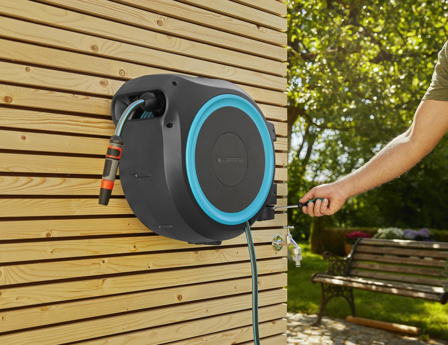 De slang trek je eenvoudig naar buiten om te gaan bewaren, vervolgens wordt hij automatisch op de gewenste lengte vastgezet wanneer u stopt dankzij de bijzonder korte vergrendelingspunten. Zodra het bewater klaar is trek je voorzichtig aan het eind van de slang en de slang trekt zich automatisch weer terug dankzij de geïntegreerde veer. Door de innovatieve RollControll-technologie gaat het oprollen veilig en gecontroleerd. De geïntegreerde slanggeleider zorgt ervoor dat de slang gelijkmatig wordt opgerold zonder dat hij in de knoop raakt.