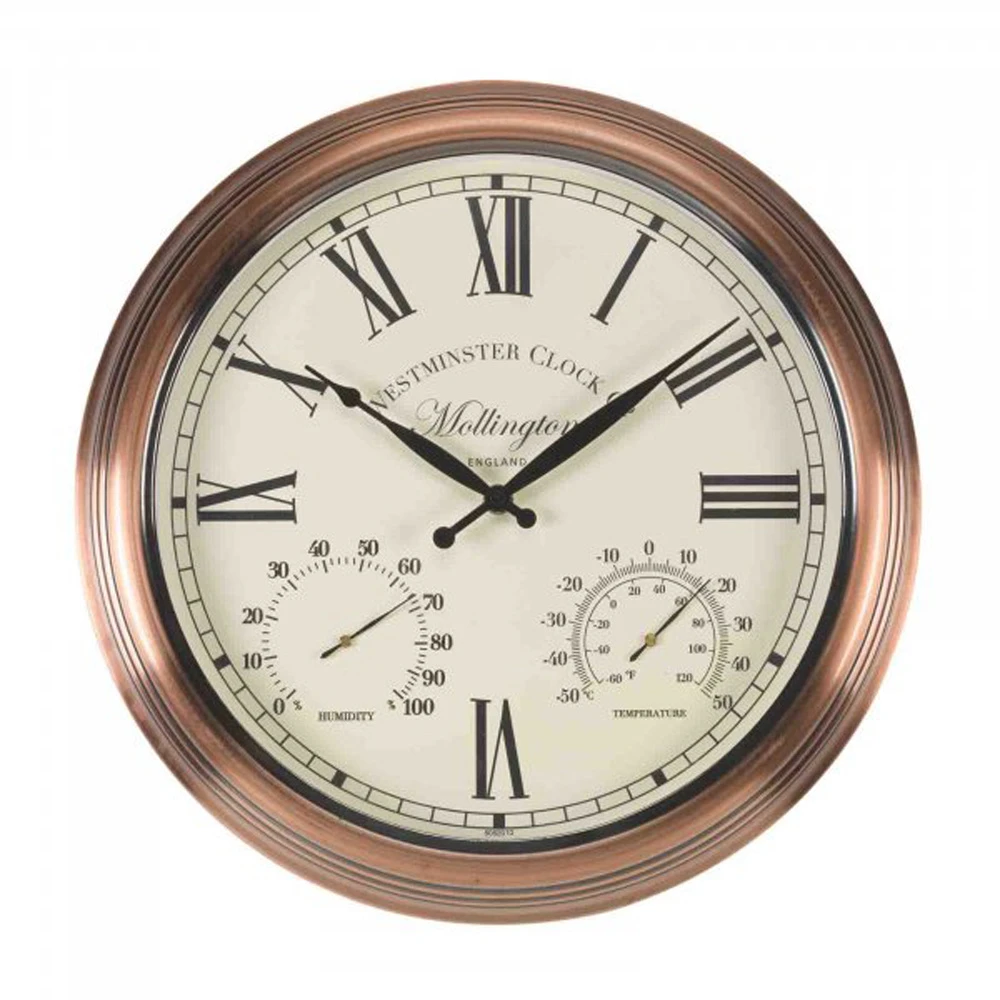 Deze 3 in 1 klok geeft niet alleen de tijd, maar ook de huidige luchtvochtigheid en temperatuur in graden Celsius en Fahrenheit weer. Geschikt voor binnen en buiten. De koperkleurige afwerking geeft de klok een traditionele uitstraling.